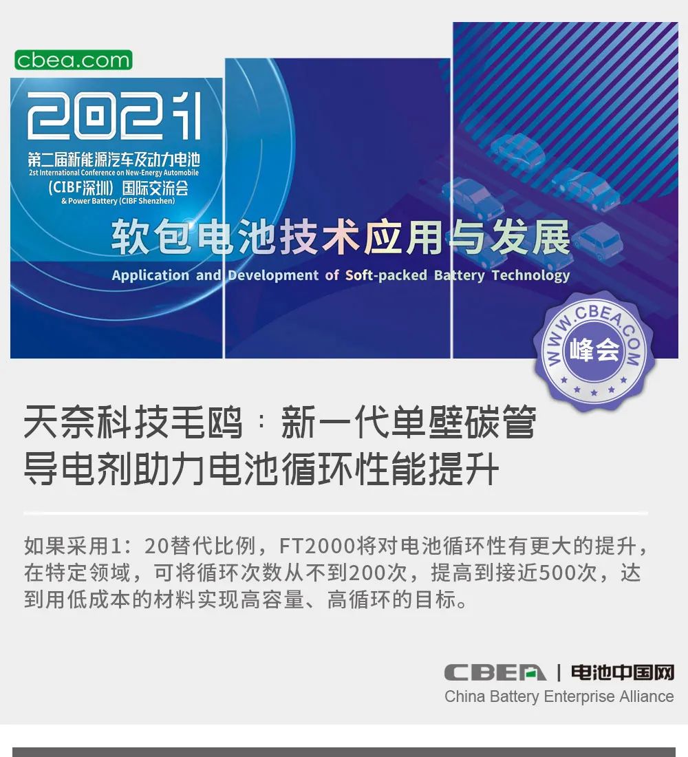 日前,“第二屆新能源汽車及動(dòng)力電池(CIBF2021深圳)國(guó)際交流會(huì)”在深圳舉行,在風(fēng)帆有限責(zé)任公司冠名的“軟包電池核心材料及先進(jìn)技術(shù)突破”專場(chǎng)論壇上,江蘇天奈科技股份有限公司研發(fā)&知識(shí)產(chǎn)權(quán)總監(jiān)毛鷗博士發(fā)表了主題為“導(dǎo)電劑發(fā)展和新一代單壁碳管導(dǎo)電劑的應(yīng)用”的演講。