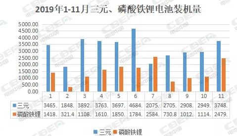 據(jù)電池中國網(wǎng)了解,由于11月新能源客車裝機量大幅增長,使得磷酸鐵鋰裝機量環(huán)比大增122.55%,達到2.48GWh,進而也使得11月磷酸鐵鋰裝機市場占比達到39.45%,較10月環(huán)比上升12%;三元電池11月裝機量3.75GWh,環(huán)比增長了27.07%,市場占比達59.63%,環(huán)比減少12%。