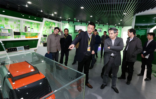 楊新新總裁向吳勝豐副主任介紹集團(tuán)新能源產(chǎn)品研發(fā)制造情況