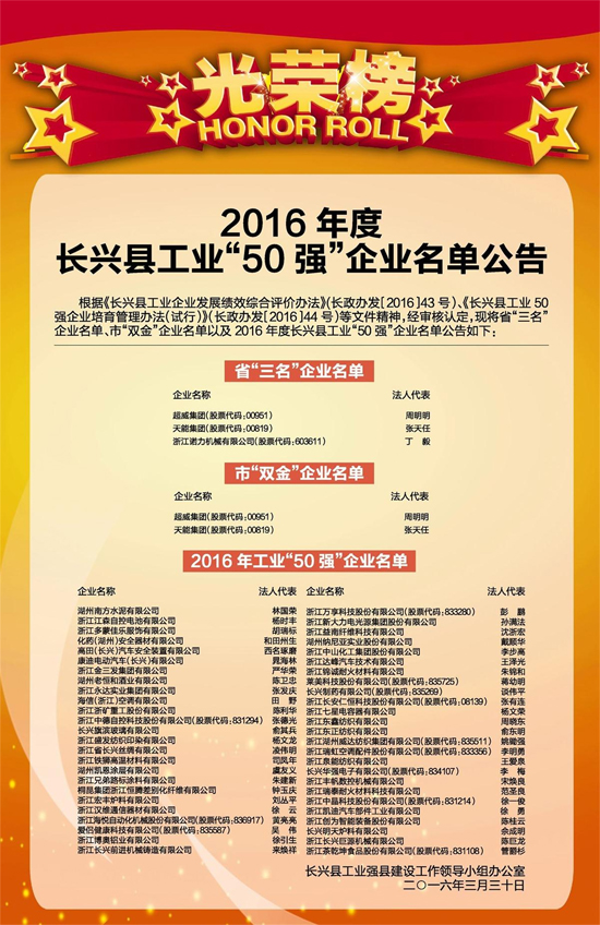 3月30日,浙江省長興縣工業強縣建設工作領導小組辦公室發布了《2016年度長興縣工業“50強”企業名單》,超威入選省三名試點企業、市雙金企業名單,成為全縣工業企業中實至名歸的排頭兵、領頭羊。