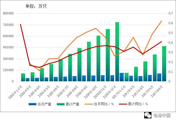 據(jù)國(guó)家統(tǒng)計(jì)局最新公布數(shù)據(jù)顯示,2017年6月,全國(guó)鋰離子電池產(chǎn)量為105986.9萬(wàn)只,同比增長(zhǎng)77.02%;1-6月累計(jì)完成產(chǎn)量為468348.8萬(wàn)只,同比增長(zhǎng)57.37%。