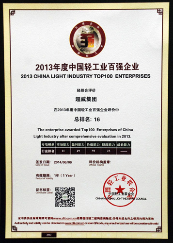 “中國輕工業百強企業”榜單是評價輕工業企業競爭力的權威榜單,也是衡量中國輕工業企業發展活力的重要標準。據了解,本次榜單經中國輕工業聯合會按照統一評價體系,對2013年度企業營業收入、利潤總額、營業收入利潤率、稅收占利稅的比重及營業收入增速五項指標綜合評審之后,再經中國輕工業聯合會會長辦公會審定通過,共評價出100家企業為2013年度中國輕工業百強企業。