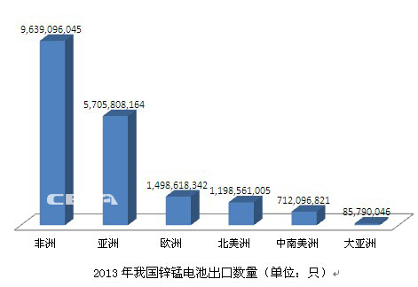 據中國化學與物理電源行業協會發布的《2013年我國電池產業出口數據》,2013年,我國鋅錳電池出口量為188.39億只,2012年出口量為186.49億只,出口量同比增長1.01%。2013年鋅錳電池出口額為10.17億美元,2012年出口額為10.27億美元,同比減少0.97%。其中,出口非洲金額同比增長7.4%,出口亞洲同比減少15.9%。出口歐洲同比減少4.4%,出口北美同比增長8.2%。