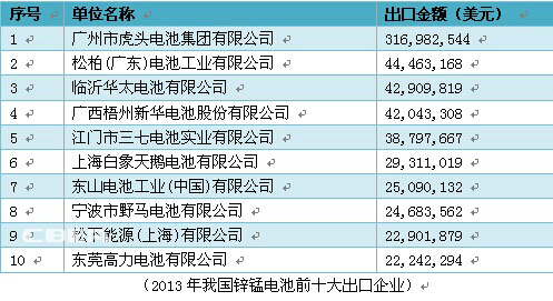 2013年,廣州市虎頭電池集團有限公司、松柏(廣東)電池工業有限公司、臨沂華太電池有限公司等企業鋅錳電池出口量排在前三位,鋅錳電池出口前十大企業出口金額總計達到609,425,392美元。