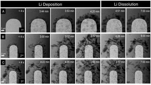 在圖中,鋰(圖中黑色細毛狀物體)在每個放電周期后都會暫時沉積上電極上,但不會完全溶解。如此一來,多次重復后每次可以利用的鋰就會越來越少,亦即為電量降低。
