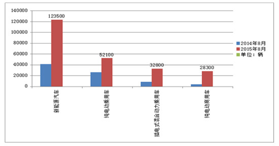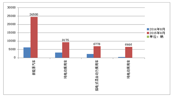 2015年8月,我國新能源汽車生產(chǎn)2.45萬輛,同比增長近4倍。其中,純電動乘用車生產(chǎn)9175輛,同比增長近3倍,插電式混合動力乘用車生產(chǎn)6778輛,同比增長3倍;純電動商用車生產(chǎn)6446輛,同比增長21倍,插電式混合動力商用車生產(chǎn)2142輛,同比增長近1.5倍。列入《免征車輛購置稅的新能源汽車車型目錄》前四批的新能源汽車生產(chǎn)2.16萬輛,占8月產(chǎn)量的88%。