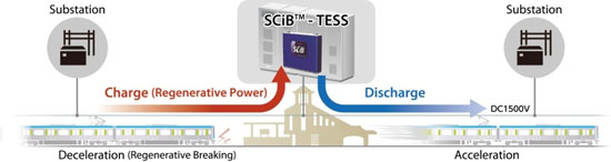 東芝公司的TESS安裝在Tobu Urban Park Line線的Unga站,使用東芝SCiBTM可充電電池儲(chǔ)存再生電能。SCiBTM擁有出色的性能,包括安全性高、荷電范圍廣、低溫運(yùn)行穩(wěn)定等。東芝公司的TESS的電池容量是傳統(tǒng)牽引式儲(chǔ)能系統(tǒng)的10倍,可以實(shí)現(xiàn)高效地充放電。此外,TESS還采用了東芝公司擁有專利權(quán)的充放電控制技術(shù),可以充分利用SCiBTM廣泛的荷電范圍。