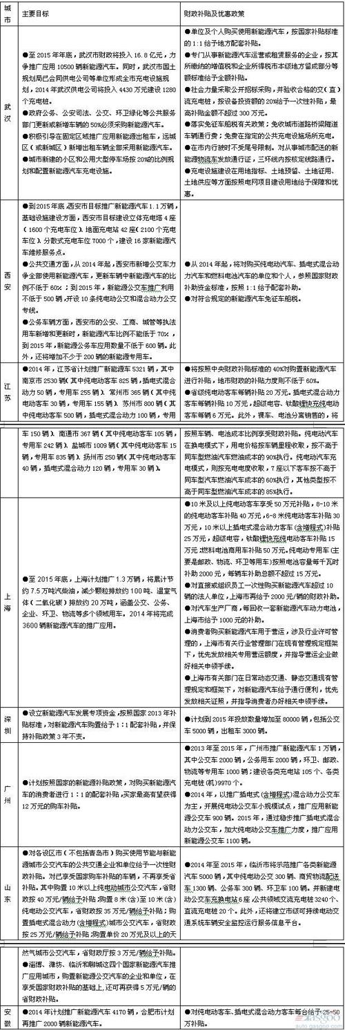 2014年,財(cái)政部、科技部、工信部、發(fā)改委(以下簡(jiǎn)稱四部委)聯(lián)合發(fā)布新能源汽車補(bǔ)貼標(biāo)準(zhǔn)調(diào)整計(jì)劃,并于同期公布第二批新能源汽車推廣應(yīng)用城市名單,全國(guó)共有12個(gè)區(qū)域的26個(gè)城市入圍。隨后,多個(gè)省市密集發(fā)布新能源汽車補(bǔ)貼政策細(xì)則,包括新能源汽車推廣目標(biāo)、充換電等基礎(chǔ)設(shè)施建設(shè)規(guī)劃、新能源汽車補(bǔ)貼標(biāo)準(zhǔn)及相關(guān)優(yōu)惠政策等。本文將以商用車為主線,以表格形式對(duì)各地關(guān)于新能源政策進(jìn)行了匯總。