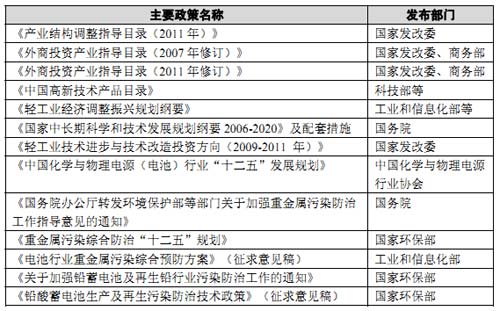 《產業結構調整指導目錄(2011年)》中將鋰離子電池、新型結構(卷繞式、管式等)密封鉛蓄電池等動力電池、儲能用鋰離子電池和新型大容量密封鉛蓄電池、超級電池和超級電容器列為鼓勵發展的輕工產品;將開口式普通鉛酸蓄電池、含鎘高于0.002%的鉛酸蓄電池(2013年底之前淘汰)列為淘汰類產品。《外商投資產業指導目錄(2007年修訂)》將高容量全密封免維護鉛酸蓄電池列為鼓勵外商投資產業,將開口式(即酸霧直接外排式)鉛酸電池列為禁止外商投資產業;《外商投資產業指導目錄(2011年修訂)》將開口式(即酸霧直接外排式)鉛酸電池列為禁止外商投資產業。發行人主導產品AGM和膠體電池屬于鼓勵發展的產品,發行人所生產的產品不包括上述淘汰類產品。