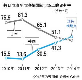 韓國(guó)汽車電池市占率正在趕超日本,成為全球第一。市場(chǎng)調(diào)查企業(yè)B3稱,去年世界電動(dòng)車電池銷售量的51.1%都是日本企業(yè)的,韓國(guó)占41.3%。早期的電池市場(chǎng)日本占了70%以上,業(yè)內(nèi)人士預(yù)期,今年韓國(guó)開(kāi)始趕超日本,估計(jì)在小型電池和中大型電池上都會(huì)成為第一名。