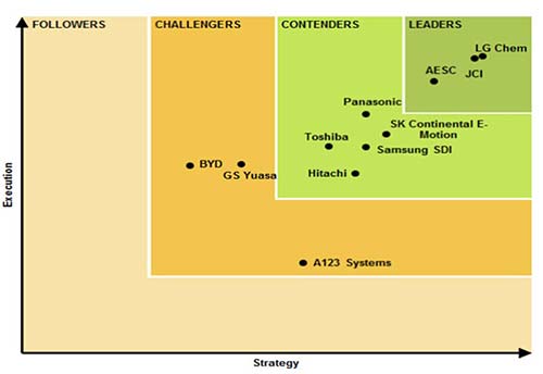 在美國(guó)咨詢公司Navigant Research的全球十大鋰離子電池供應(yīng)商排行榜中,韓國(guó)LG化學(xué)排名第一,三星也榜上有名。Navigant Research認(rèn)為,無(wú)論從技術(shù)、市場(chǎng)戰(zhàn)略還是企業(yè)執(zhí)行力上看,LG化學(xué)都是當(dāng)之無(wú)愧的電池行業(yè)領(lǐng)軍者。