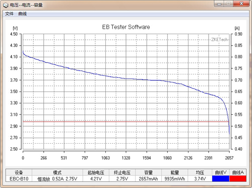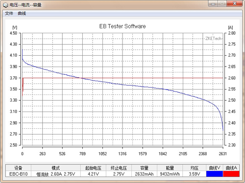 力神18650 2600mAh在室溫26度環(huán)境下經(jīng)過5小時6分鐘34秒放電至2.7V終止電壓,得出實測容量是2657mAh,能量9935mWh,平均電壓3.74V。如圖中藍(lán)色放電曲線標(biāo)注。