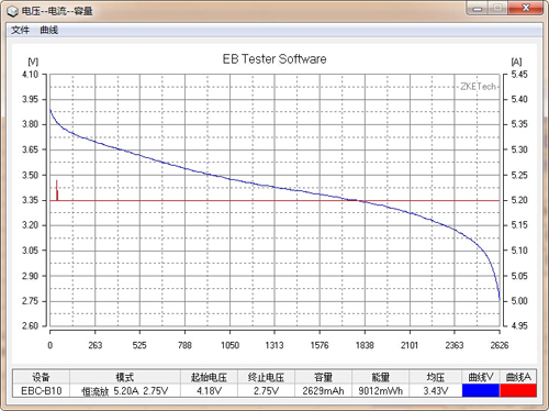 可以看到即使是2C(5.2A)大電流放電,力神2600的容量依然達到2600mAh以上,且與1C容量相差無幾,證明力神2600的大電流放電性能十分優異。