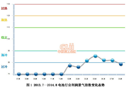 2014年8月利潤景氣指數為78.54,與7月81.80下降3.26百分點,在保持4個月“漸冷”提示區(qū)后,重入“過冷”提示區(qū)。(參見圖1)
