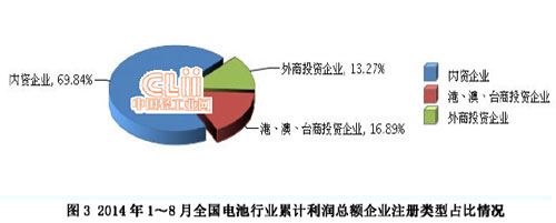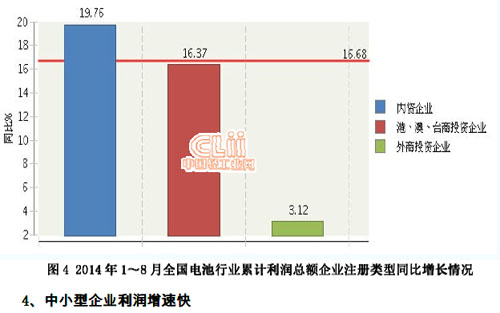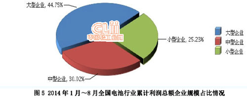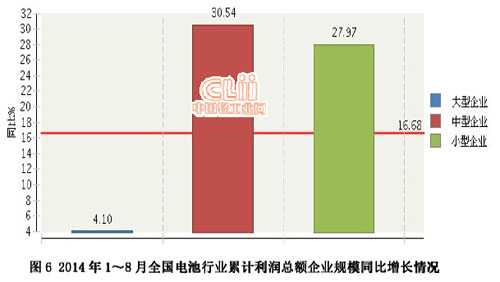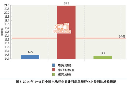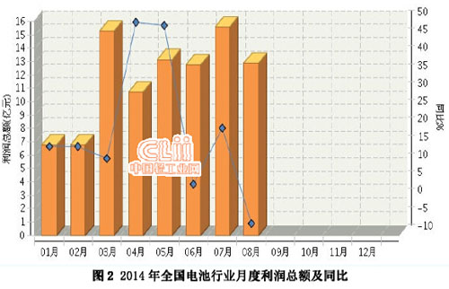 2014年1~8月,全國電池行業(yè)累計完成利潤總額同比增長16.68%。其中:8月份完成利潤總額12.86億元,同比下降6.75%。