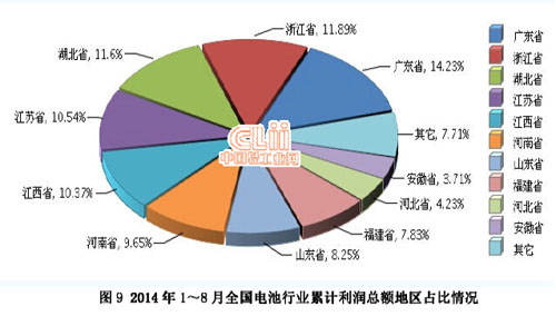 2014年1~8月全國電池行業(yè)利潤較高的產區(qū)主要集中在廣東、浙江、湖北、江西、江蘇、河南、山東、福建、河北、安徽地區(qū),10 個地區(qū)完成利潤總額占全國的92.29%。(參見圖9)