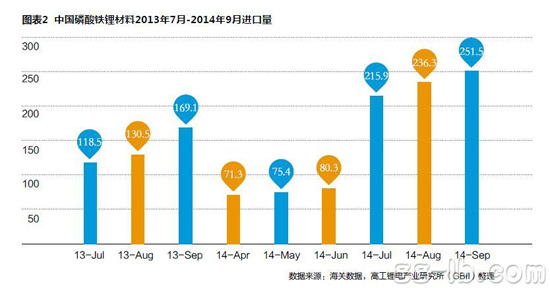 新能源汽車銷量銷售38163輛,比2013年同期增2.8倍,直接拉動磷酸鐵鋰的需求,但國內磷酸鐵鋰材料制造商享受的紅利有限。主要原因有:(1)國內動力電池巨頭自主生產磷酸鐵鋰,外部采購量有限,如比亞迪、國軒高科等;(2)進口磷酸鐵鋰的性能優勢,中高端電芯廠趨于采購國外的磷酸鐵鋰,因此第三季度國內磷酸鐵鋰進口量增長較大。2014年第三季度中國進口磷酸鐵鋰704噸(圖表2),同比增長68.4%,環比增長210%。