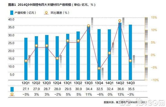 2014年第三季度國內鋰電四大關鍵材料產值規模為35.47億元(圖表1),環比下降3%。四大材料中,除了隔膜外,其他材料的銷售額均出現環比下降。原因有:(1)下游應用市場,除了新能源汽車,3C與儲能市場在第三季度表現一般,導致銷量環比下滑;(2)由于四大材料的產能均嚴重過剩,供大于求,價格持續下滑。