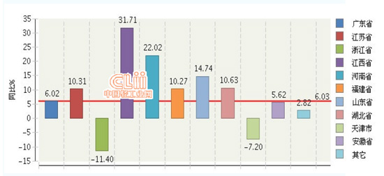 圖10 2014年1~9月全國電池行業累計主營業務收入主要地區同比增長情況