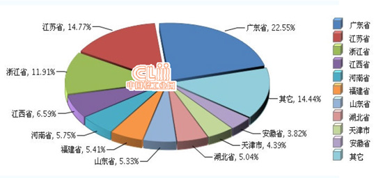 2014 年1~9 月全國電池行業主營業務收入較高的產區主要集中在廣東、江蘇、浙江、江西、河南、福建、山東、湖北、天津、安徽地區,十個地區完成主營業務收入占全國的85.56%。(參見圖9)。