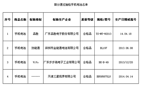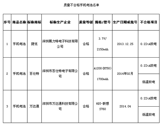 抽檢中發(fā)現(xiàn),標(biāo)稱深圳展力特電子科技有限公司生產(chǎn)的一批次“捷優(yōu)” 手機電池被檢出0.2ItA放電項目不合格;標(biāo)稱深圳市百仕特電子有限公司生產(chǎn)的一批次“百仕特” 手機電池、標(biāo)稱深圳市萬達(dá)通科技有限公司生產(chǎn)的一批次“萬達(dá)通” 手機電池被檢出0.2ItA放電、低溫放電項目不合格。