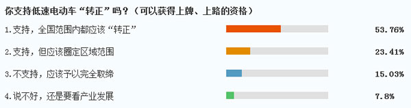 對于這一爭議話題,參與調查的77.17%的網友都對于低速電動車“轉正”表示了支持,其中53.76%的網友更是認為應該在全國范圍內將低速電動車“扶正”,充分滿足市場的需求。