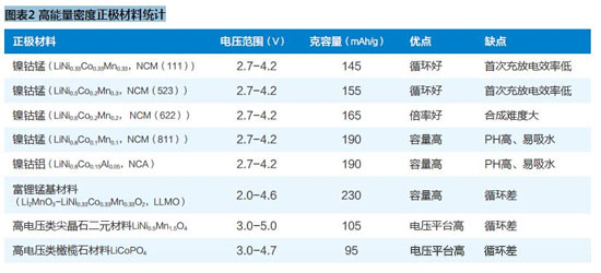 由前述鋰離子電池能量密度的計(jì)算方法可知,通過(guò)采用高容量正極或高電壓正極,可顯著提升單體電池能量密度。
