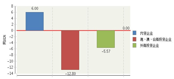 從企業注冊類型看,內資企業主營業務收入占比較大。內資企業完成累計主營業務收入占67.31%,同比增長6%;港、澳、臺商投資企業完成累計主營業務收入占21.43%,同比增長-12.8%;外商投資企業完成累計主營業務收入占11.25%,同比增長-5.57%。(參見圖3、圖4)
