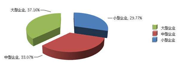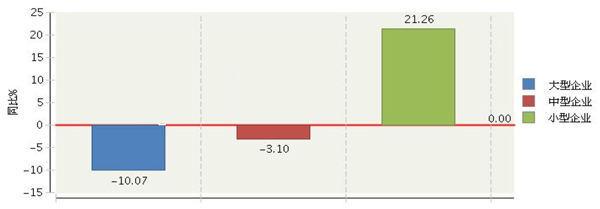 從企業規模看,小型企業增長速度加快。大型企業完成累計主營業務收入占37.16%,同比增長-10.07%;中型企業完成累計主營業務收入占33.07%,同比增長-3.1%;小型企業完成累計主營業務收入占29.77%,同比增長21.26%。(參見圖5、圖6)