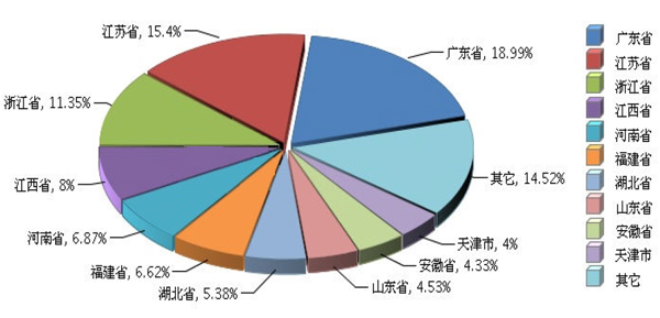 2015 年1~5 月全國電池行業主營業務收入較高的產區主要集中在廣東、江蘇、浙江、江西、河南、福建、湖北、山東、安徽、天津地區,十個地區完成主營業務收入占全國的85.48%。(參見圖9)