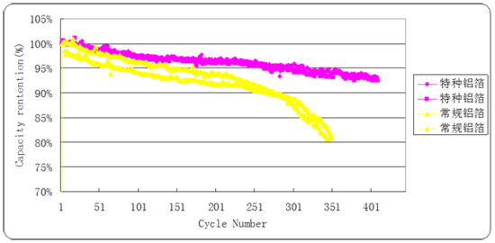 由于特種鋁箔具有較好的物理性能,使得電池的循環性能得到顯著改善。