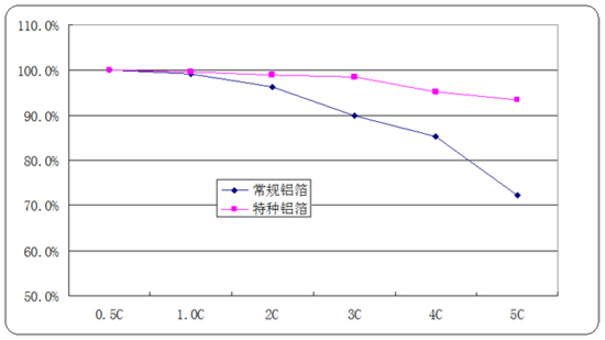 采用特種鋁箔后,電池的倍率性能顯著提升,特別是在大倍率(大于3C)的情況下,倍率放電容量提升在15%以上,或者在同等倍率情況下,特種鋁箔可以提高電池的能量密度。