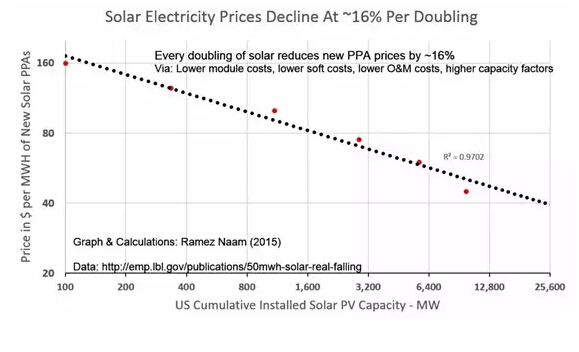 如果累計(jì)裝機(jī)容量翻一倍,那么電價(jià)就會(huì)按照一個(gè)可預(yù)見的規(guī)律下降。在太陽能組件方面,成本是以20%的速率下降。而就太陽能發(fā)電系統(tǒng)整體的發(fā)電成本而言,則是以16%的速度下降(通過組件成本降低、軟成本降低、運(yùn)營(yíng)和維修成本降低、規(guī)模擴(kuò)大等因素來實(shí)現(xiàn))。這個(gè)16%的速率意味著每當(dāng)太陽能發(fā)電裝機(jī)裝機(jī)容量翻一倍,就可以使新增裝機(jī)的電價(jià)減少16%,而且這個(gè)降價(jià)速率未來還會(huì)更快。