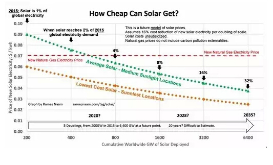 按照這樣的形勢(shì)發(fā)展,到2035年,太陽能發(fā)電的電價(jià)將比新型煤電或者天然氣發(fā)電的電價(jià)的一半還要低,這還沒有包括煤電和天然氣發(fā)電防止空氣污染的成本以及碳排放費(fèi)用等。
