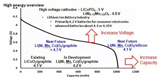 圖2 鋰離子電池比能量提升路徑(提高電壓或/和提升比容量)示意圖(摘自日本大金報(bào)告)