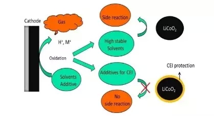 上述問(wèn)題的解決方案是尋找更加穩(wěn)定(不氧化)的溶劑或/和尋求正極/電解質(zhì)界面的穩(wěn)定方法-通過(guò)選擇添加劑來(lái)實(shí)現(xiàn)。