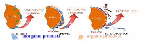 圖4顯示出LD120+ LiBOB +SUN形成了穩(wěn)定的適當(dāng)厚度與剛度的、CEI產(chǎn)物。