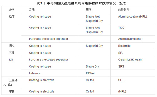 表2列出了國(guó)外幾家電池制造商采用隔膜涂層技術(shù)的情況。