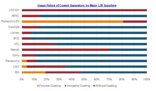 圖7 各國(guó)大型電池企業(yè)采用和未采用涂層隔膜的比例圖(取自呂學(xué)隆報(bào)告)