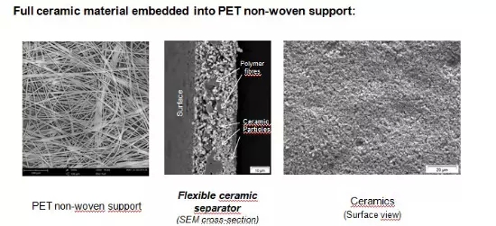 本次論壇上,德國(guó)Litarion公司一直采用PET無(wú)紡布基體制造填充有陶瓷Al2O3的隔膜,如圖8所示。這種隔膜早期在中國(guó)推廣過(guò),但是沒(méi)有取得實(shí)際應(yīng)用進(jìn)展。目前這種隔膜及其電極被用于他們與一家電動(dòng)汽車(chē)公司(Electrovaya)合資的電池公司所制造的動(dòng)力電池,再由Electrovaya制造成動(dòng)力電池包,供電動(dòng)車(chē)輛采用。其40 Ah電池以1C充放電,100% DOD下可達(dá)到9000次,容量保持在30Ah;單體電池能通過(guò)180℃烘箱以及針刺實(shí)驗(yàn),沒(méi)有安全問(wèn)題發(fā)生。