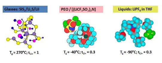 圖11 無(wú)機(jī)鹽固體電解質(zhì)、聚合物固體電解質(zhì)、有機(jī)液體電解質(zhì)結(jié)構(gòu)圖(取自Armand報(bào)告)