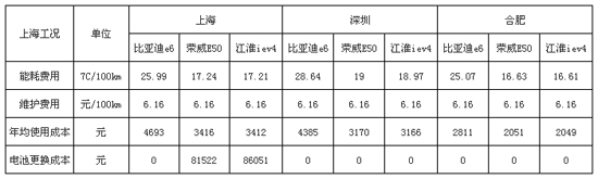 注:上海市充電電價(jià)為0.617元/kWh,深圳市充電電價(jià)為0.68元/kWh,合肥市充電電價(jià)為0.5953元/kWh。上海市消費(fèi)者日均行駛里程為40km,年均行駛14400km (假設(shè)每年行駛360天);深圳市消費(fèi)者日均行駛里程為35km,年均行駛12600km;合肥市消費(fèi)者日均行駛里程為25km,年均行駛9000km。在車輛維護(hù)費(fèi)用方面,主要包括車輛維護(hù)保養(yǎng)費(fèi)、車輛維修費(fèi)、保險(xiǎn)費(fèi)、養(yǎng)路費(fèi)等,純電動(dòng)汽車年檢保養(yǎng)費(fèi)用約為每l00km/6.16元,普通車輛為每l00km/14元;在電池更換成本方面,本文取電池循環(huán)充電次數(shù)為2000次。