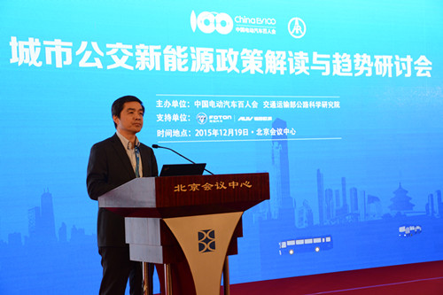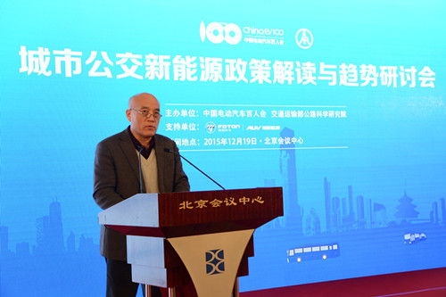 2015年12月19日,由中國電動汽車百人會與交通運輸部公路科學(xué)研究院聯(lián)合舉辦的“城市公交新能源政策解讀與趨勢研討會”在北京召開,國務(wù)院發(fā)展研究中心原黨組書記陳清泰、交通運輸部運輸服務(wù)司副司長王水平、工業(yè)和信息化部裝備工業(yè)司副巡視員瞿國春、中國道路運輸協(xié)會城市客運分會理事長張國光、中國電動汽車百人會執(zhí)行副理事長歐陽明高等參加會議并講話。